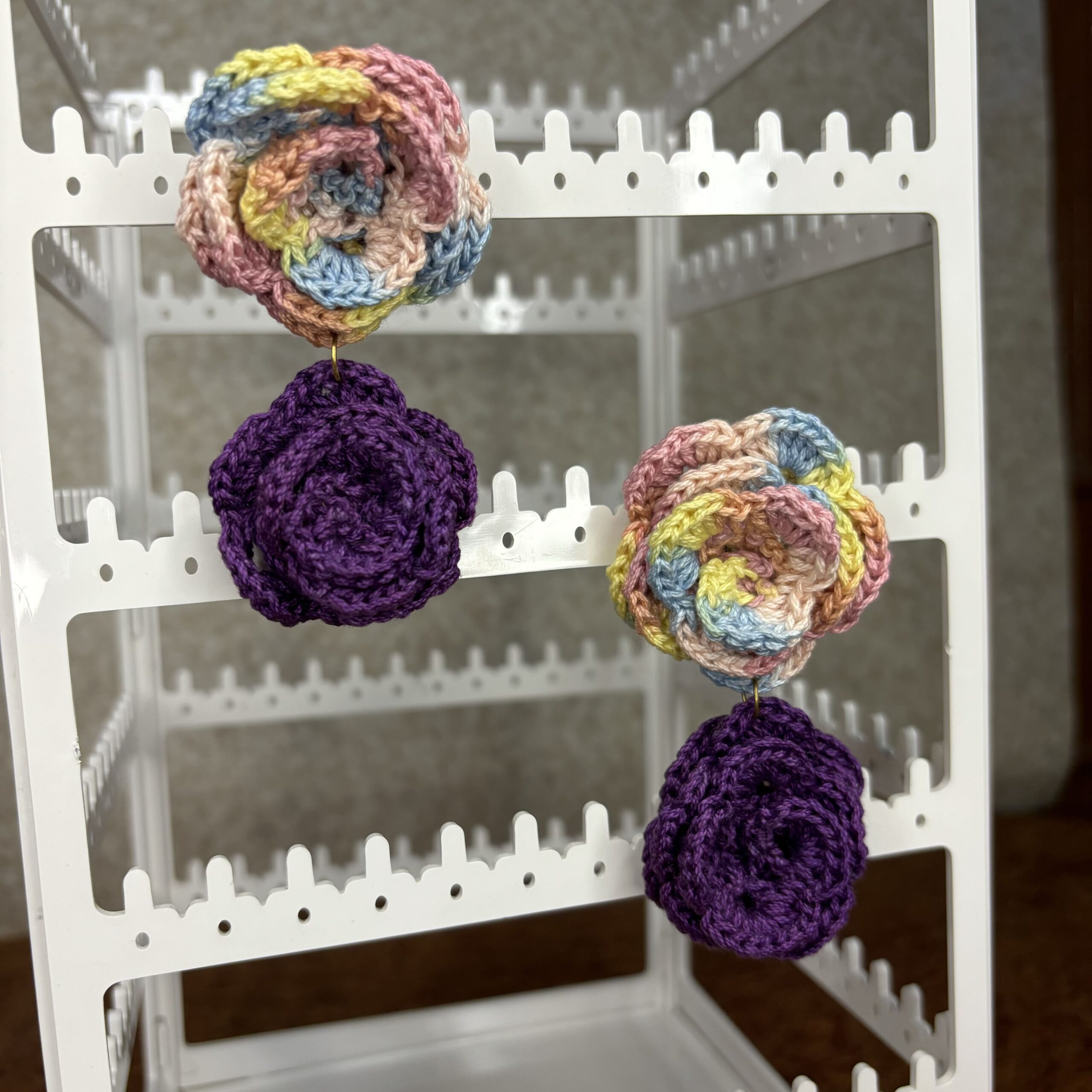 These stunning handmade earrings feature two delicately crocheted roses—one in a rich purple hue on top and a vibrant, multicolored rose below—crafted from fine-quality cotton thread.