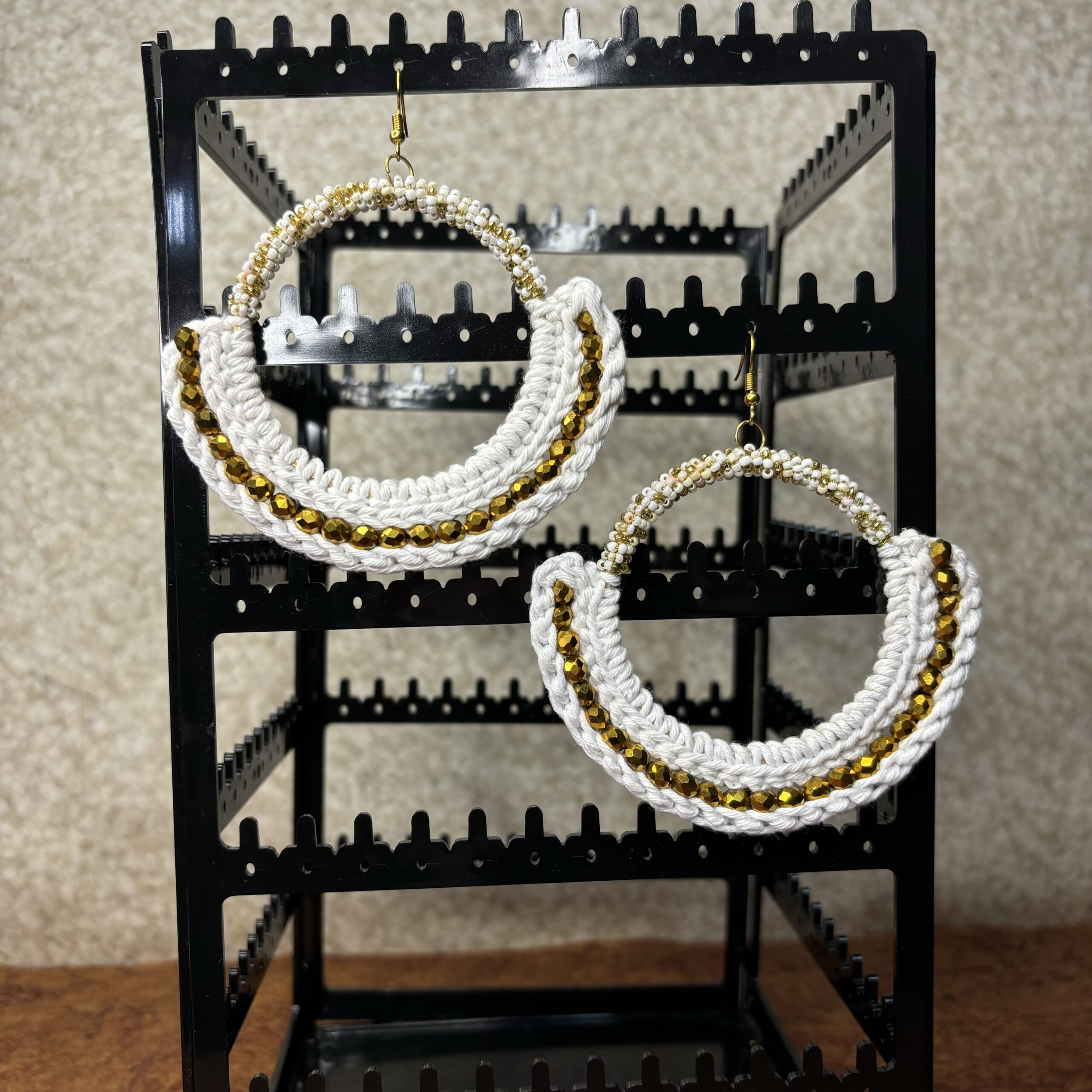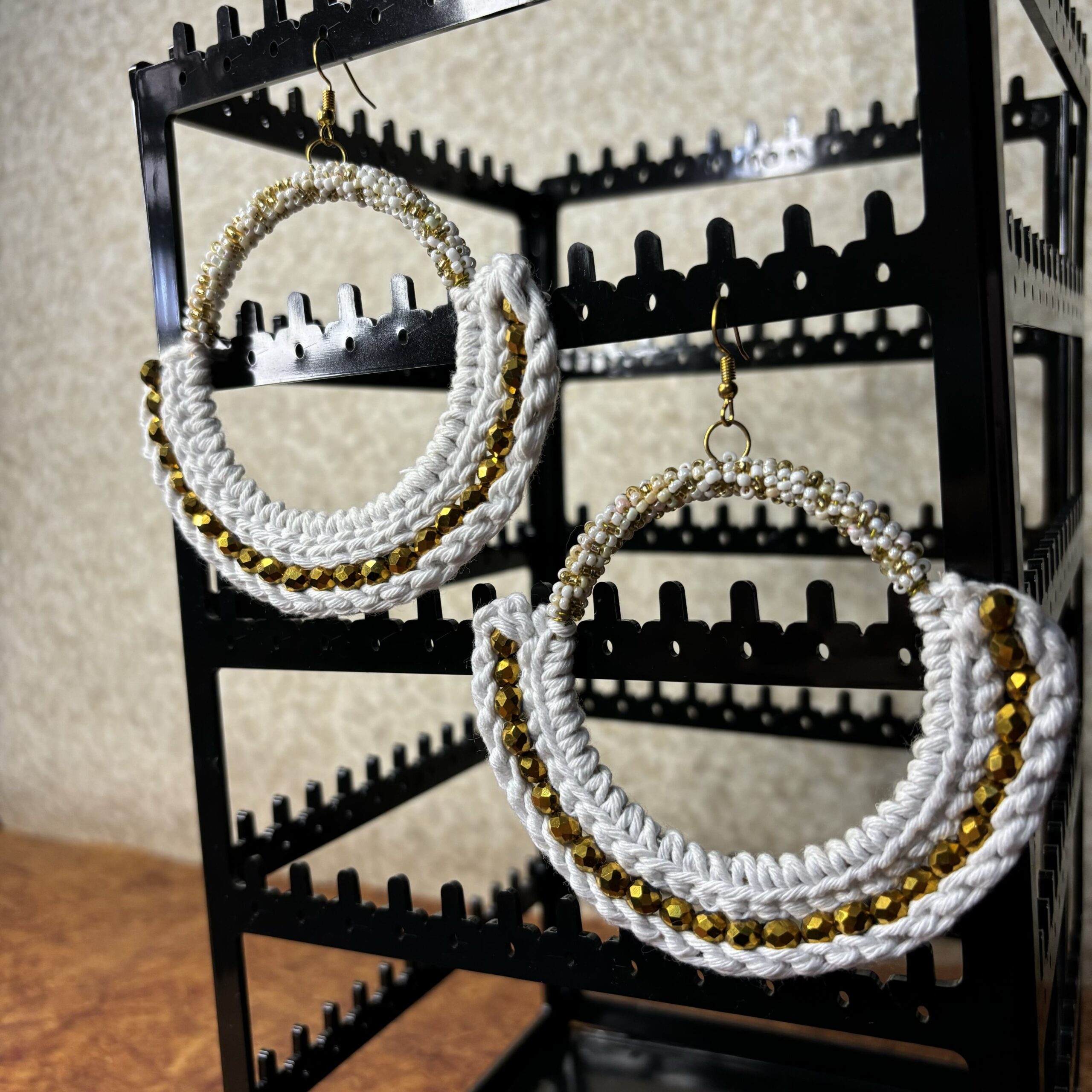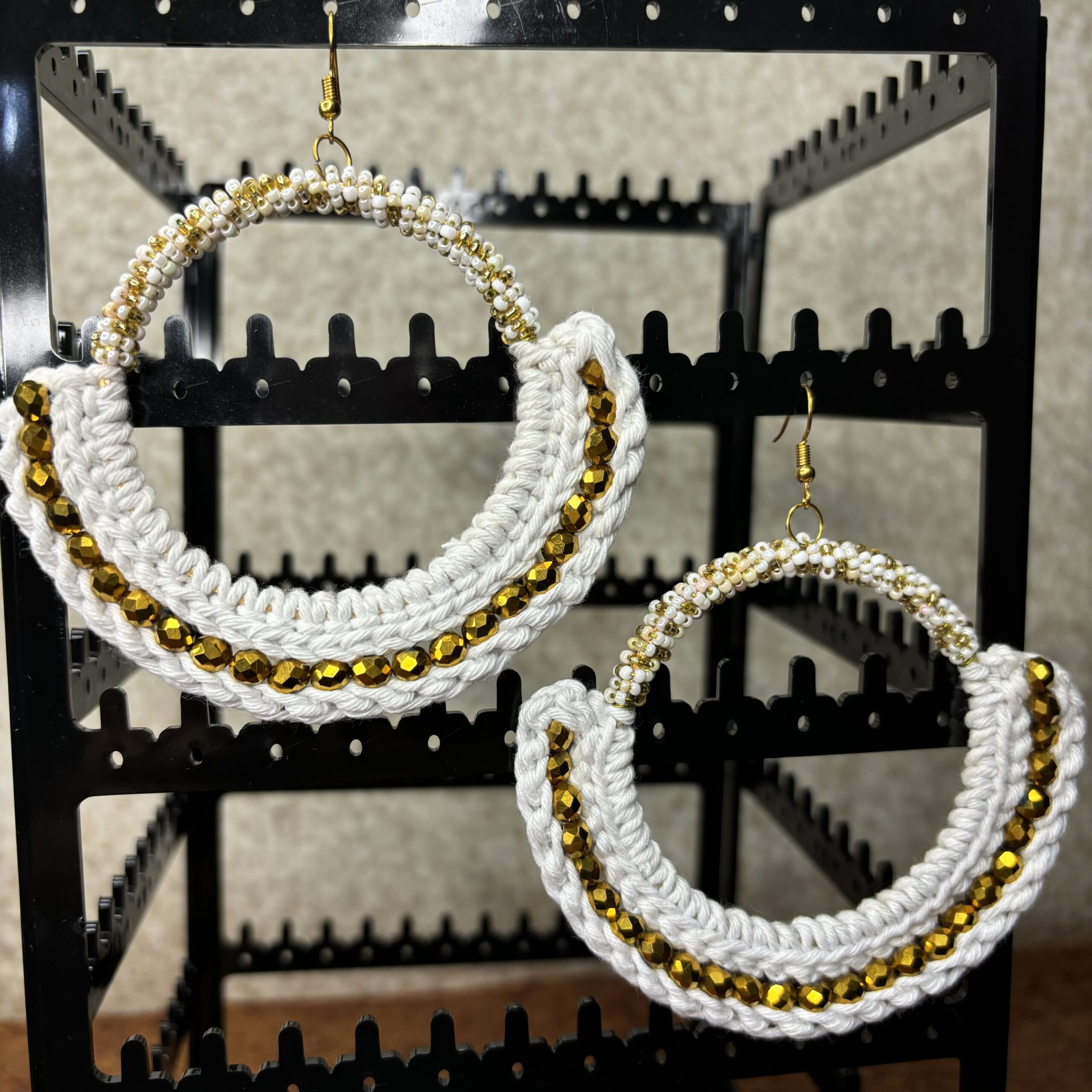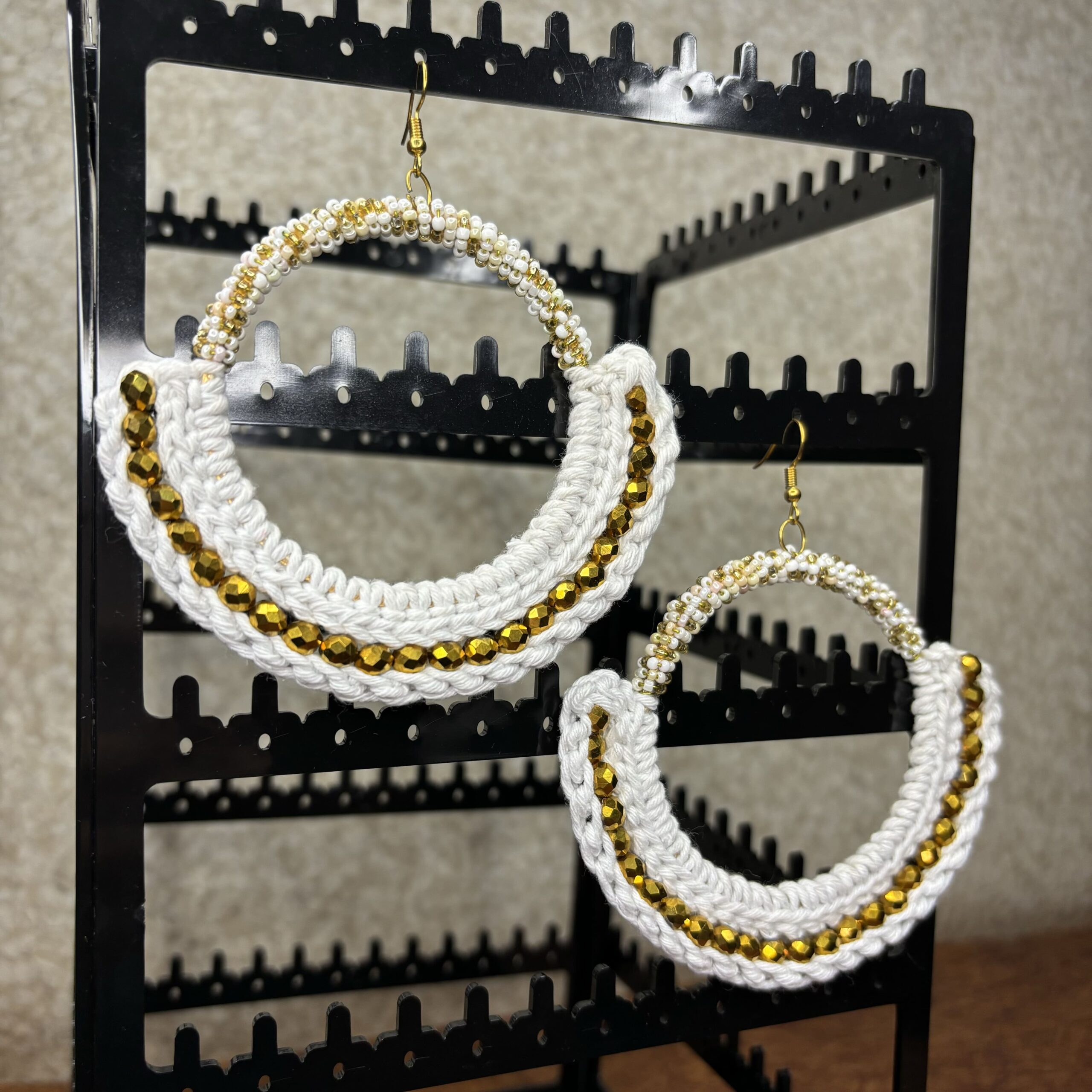 Make a bold style statement with our big crocheted hoop dangle earrings, handcrafted with soft white thread and adorned with shimmering golden beads. The perfect blend of boho-chic and modern elegance, these oversized handmade hoops add a touch of playful flair to any ensemble. Lightweight and eye-catching, they’re ideal for adding a dash of creativity to your look.